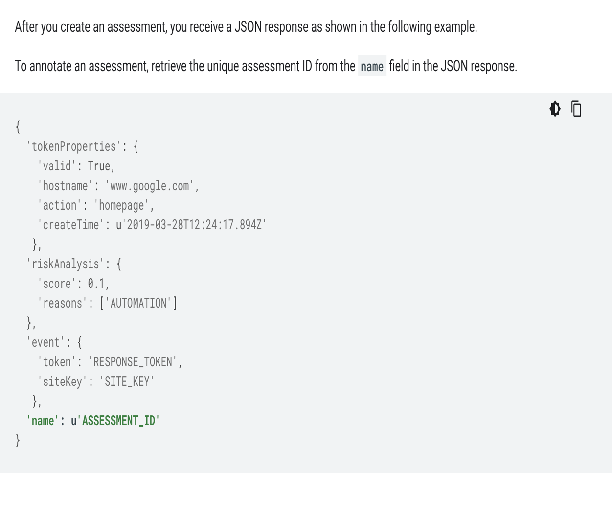 Once the token is generated you should pass this token back to your backend server logic for further validation with Google API.This API is called “Assessment” API